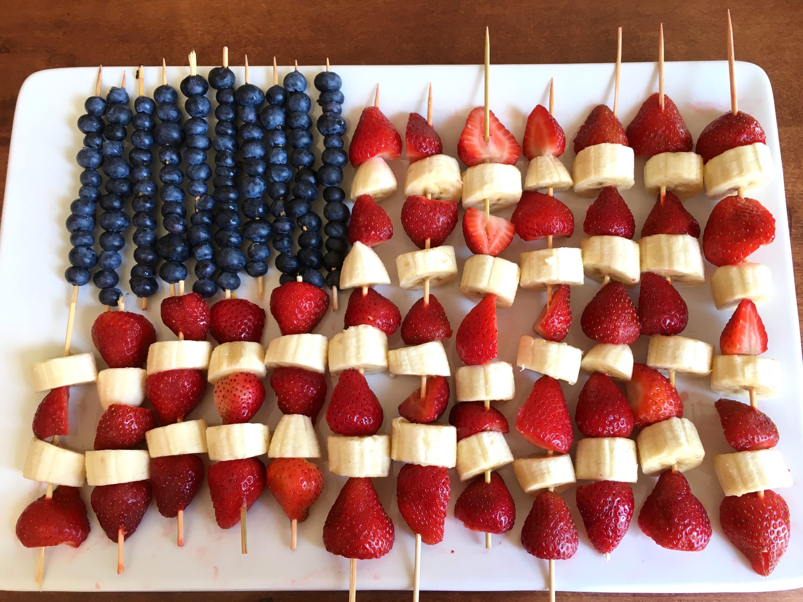 This is one of our favorite 4th of July snacks. Who can resist a fruit flag? Kids have a lot of fun putting the fruit on the skewers….we sure did!