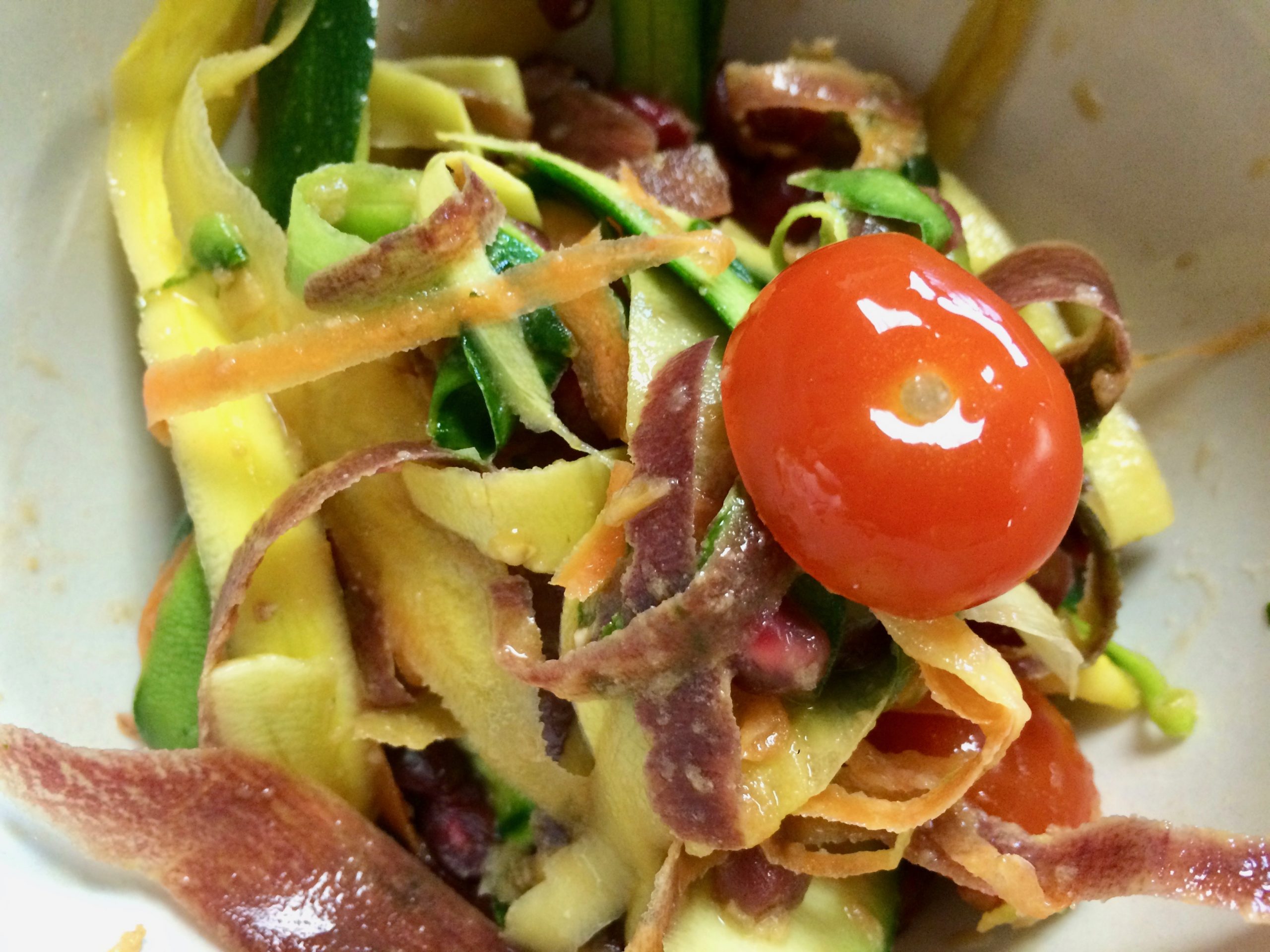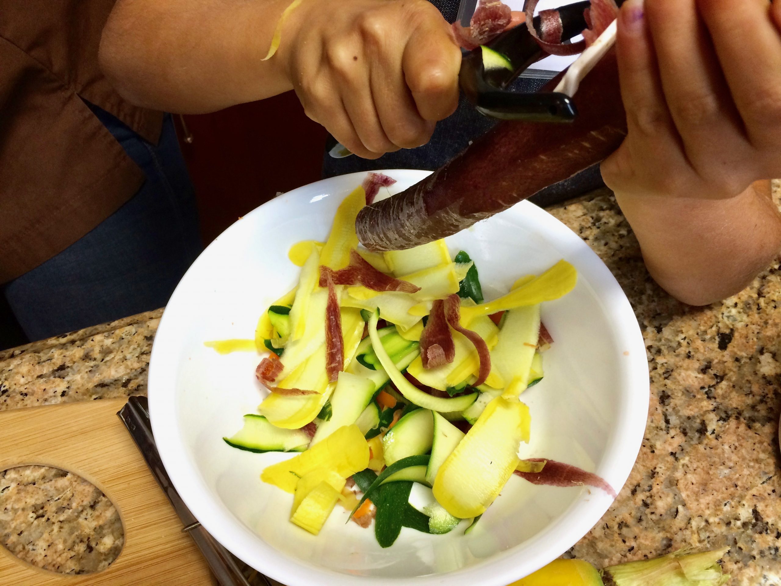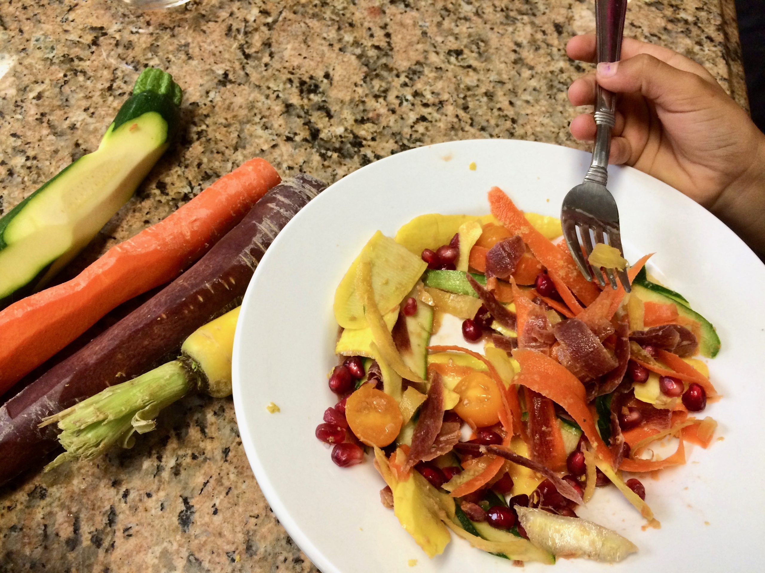We had a lot of fun using peelers to shave zucchini, yellow summer squash, and rainbow carrots (did you know that carrots come in a rainbow of colors….including purple?!) into veggie ribbons.